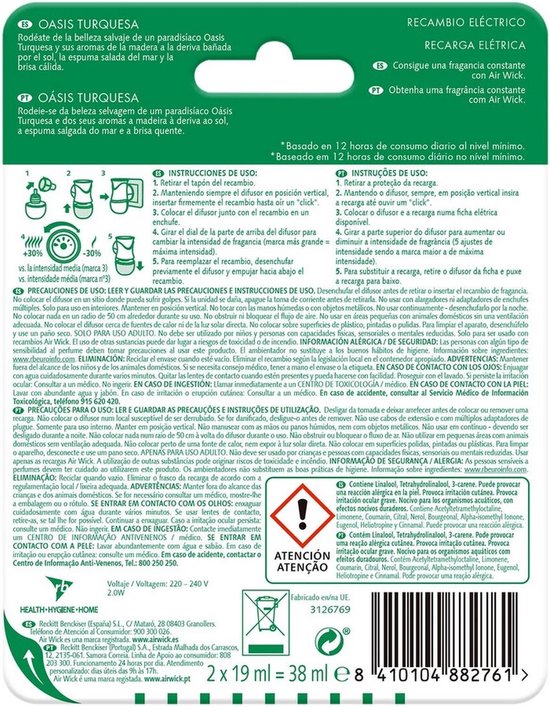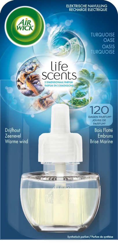 De Elektrische Geurverspreider van Air Wick creëert een heerlijk atmosfeer in je huis en verspreidt automatisch heerlijke geuren, tot wel 120 dagen lang! Plug de geurverspreider in je stopcontact en kies zelf de gewenste geurintensiteit. Met de Air Wick Elektrische Geurverspreider Luchtverfrisser Life Scents Turqouise Oase Navulling trakteer je jezelf op een frisse oase in uw eigen toevluchtsoord met de geur van zeespray, warme bries en drijfhouttonen.