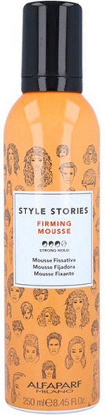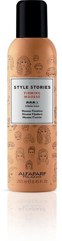 Alfaparf Style Stories Firming Mousse, een sterke fixatie mousse ideaal voor krullend haar en lastige kapsels. Droogt het haar niet uit en blijft goed in model. Haar kan makkelijk gereset worden. Verrijkt met Moringa olie voor UV bescherming en een prachtige glans.