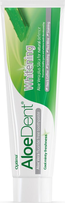 Voor een gezond gebit. Voor witten van tanden gekleurd door koffie, thee, roken, rode wijn etc…..Met Aloe Vera – Silica – P.V.P. (emulgator) – Vitamine K – Tea Tree- Pepermunt – Menthol. Aloe Dent tandpasta’s zijn gemaakt met een unieke combinatie van natuurlijke ingredienten. De tandpasta bevat als belangrijk werkzaam bestanddeel Aloe Vera sap. Het bevat geen fluor. De tandpasta is in gel-vorm zonder polijstende stoffen zoals kalk. Aloe Dent tandpasta’s zijn gemaakt met een unieke combinatie van natuurlijke ingredienten. Regelmatig tanden poetsen helpt gaatjes, tandplaque, tandsteen en tandvleesproblemen voorkomen.