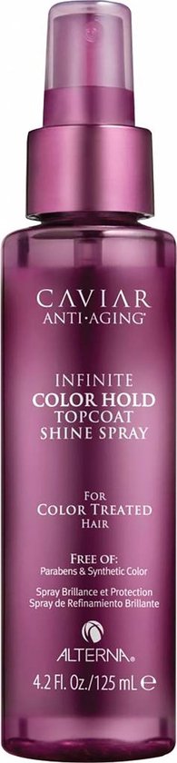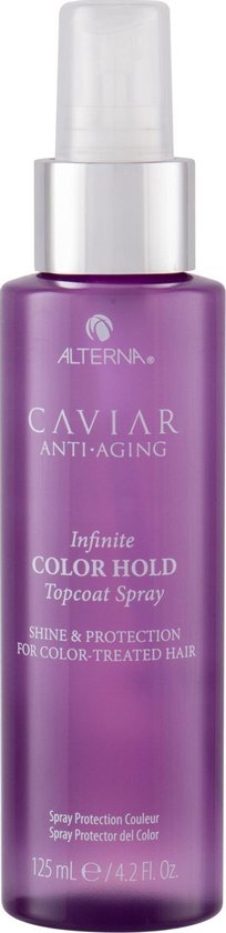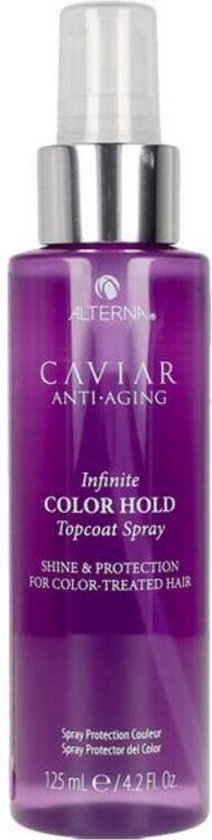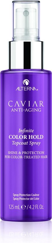 Alterna Caviar Anti Aging Infinite Color Hold Topcoat Shine Spray Deze ultralichte voedende formule beschermt het haar tegen externe schadelijke invloeden en behoudt de kleur De belangrijkste laatste stap voor een mooie levendige kleur met reflecterende glans