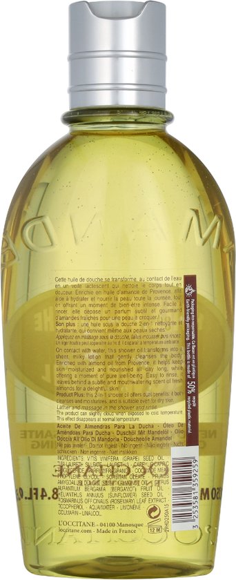 L Occitane Amande Huile de Douche Olie Deze olie verzacht de huid dankzij de aanwezigheid van zoete amandelolie Deze is rijk aan voedende lipiden en respecteert de natuurlijke hydratatie van de opperhuid Er wordt een zeer lichte zachte en satijnachtige laag met een lichte geur van verse amandelen op de huid achtergelaten Gebruik Aanbrengen op de natte huid grondig afspoelen