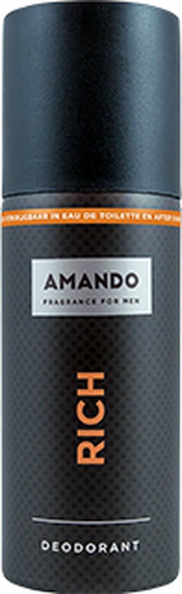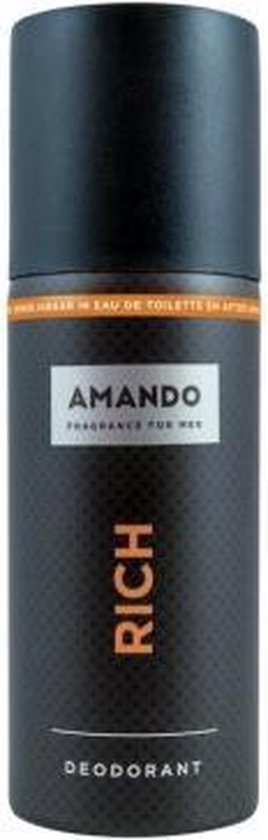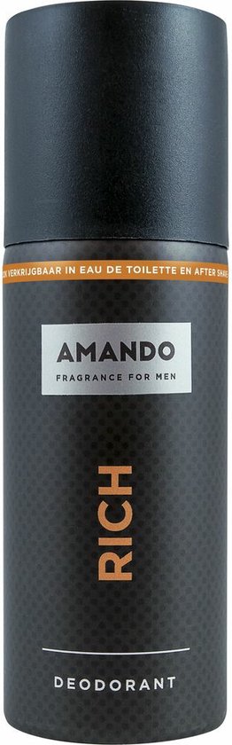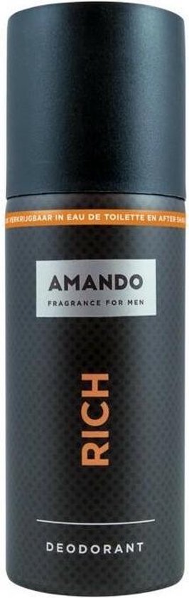 Amando Rich Deospray geeft een krachtige en warme geur waarin friszoete accenten van mandarijn en bergamot, gecombineerd worden met de zoete kruidige geuren van cederhout, amber en kaneel. Omhul jezelf met de mannelijke geur van Amando Rich en ruik je de hele dag warm en zoet.