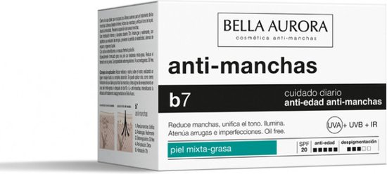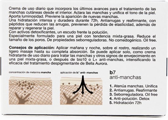 De Anti Donkere Vlekken Crème B7 Bella Aurora Spf 15 (50 ml) is een kwaliteitsproduct dat is ontworpen voor veeleisende personen die zorg dragen voor hun uitstraling en op zoek zijn naar de beste cosmetica om hun schoonheid extra in de verf te zetten. Als jij een van hen bent, zijn de 100 % originele Bella Aurora producten voor jou gemaakt.