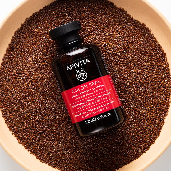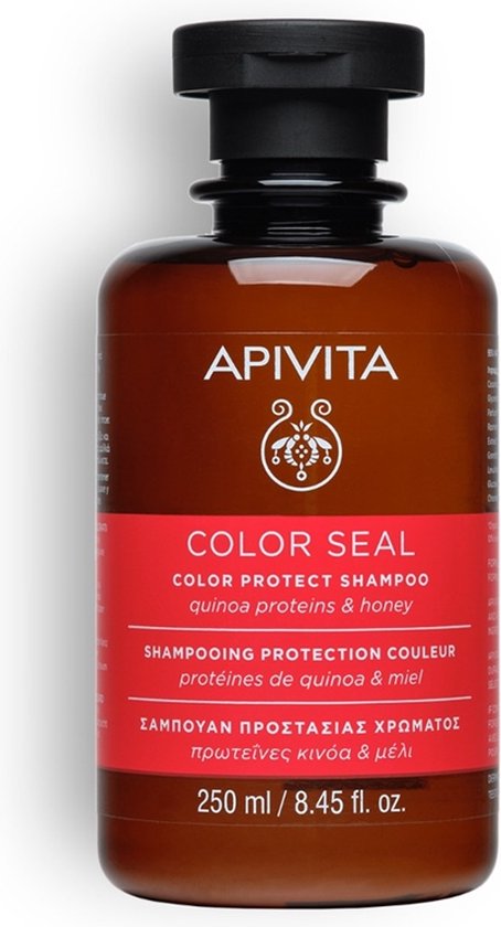 Apivita Color Protect Shampoo Ben jij op zoek naar een natuurlijke shampoo voor gekleurd haar die; – de huid en het haar op milde wijze reinigt, zonder sulfaten, siliconen of ongewenste ingrediënten? – de duur en intensiteit van de haarkleur verlengt, terwijl je het haar en de punt beschermt tegen dehydratatie? – helpt tegen het vaal worden van de kleur en zorgt voor een prachtige boost? Rijke, maar toch zeer milde shampoo tegen gekleurd haar zonder sulfaten en siliconen Als je van de kapper terugkomt wil je dat je haar zo lang mogelijk prachtig gekleurd blijft. Zonder vaal te worden, zonder te pluizen, zonder een geïrriteerde hoofdhuid. Nee, je wil natuurlijk die coupe van kapperskwaliteit zolang mogelijk behouden. Dat kan met de natuurlijke shampoo voor gekleurd haar van Apivita Griekse cosmetica. Dankzij de kleurbehoudende extracten, regenererende werkstoffen, hydraterende ingrediënten en talrijke antioxidanten bescherm je de haarkleur, verleng je de levensduur van de prachtige kleur en voorkom je het vaal worden van het gekleurde haar. Ook de hoofdhuid wordt heerlijk gekalmeerd en verzorgd en dragen de intens hydraterende ingrediënten bij aan een gezonde huidflora, vochtbalans en sterke haarvezel. Actieve ingrediënten Apivita Color Protect Shampoo •Honing• hydrateert het haar intens en zorgt voor een fantastische glans •Jasmijn stimuleert de zintuigen en geeft een heerlijk wellness-gevoel •Zeepkruid opent de haarschubben, zodat de ingrediënten dieper in kunnen trekken •Panthenol (Provitamine B5) werkt vochtbindend, wat dehydratatie na het kleuren tegengaat en herstelt •Quinoa heeft verzorgende eigenschappen en is daarom ideaal bij beschadigd haar of droge punten •Bergamot• heeft een verfrissende geurbeleving, voor een positieve draai aan je haarverzorging en een heerlijk wellnessmoment •Apishield HS verlengt de kwaliteit van de kleur en voorkomt het vaal worden van het haar •Rozemarijn infusie stimuleert het huidherstel en verzorgt het haar tot diep in de vezel • Biologisch geteeld Natuurlijke ingrediënten: 88% Dermatologisch getest Vegan: Nee Bevat geen microplastics, sulfaten, parabenen, minerale oliën (paraffine, vaseline, petrolatum), siliconen, propyleenglycol en genetisch gemodificeerde plantextracten. Fles is vervaardigd van 50% gerecycled plastic en is 100% recyclebaar. Dierproefvrij (zowel eindproduct als ingrediënten worden niet op dieren getest.) 250 ml / 8.45 fl.oz