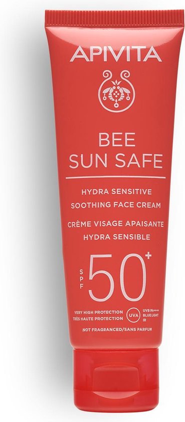 Een zachte verzorgende gezichtscrème met SPF50+ bescherming tegen blootstelling aan de zon en UVA- UVB straling. De crème is rijk aan kamille, dat verzorgende en herstellende eigenschappen heeft. Aloe vera hydrateert, voedt en verzorgt de kwetsbare huid. Verder rijk aan propolis, hyaluronzuur, panthenol, vitamine E en wilde roos extract. Zeer geschikt voor de gevoelige huid.