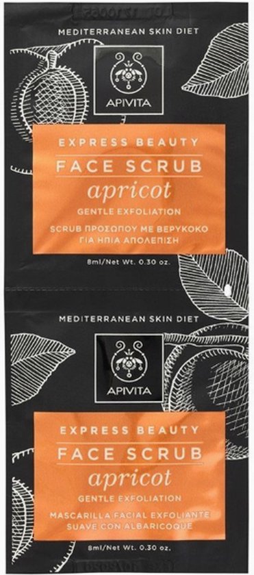 De gezichtsscrub met abrikoos, reinigt de huid zacht zonder het te dehydrateren. Het exfolieert zacht de huid en verwijdert dode cellen dankzij de fijngemalen abrikozenzaden. Het verbetert de textuur van de huid, door het zacht en verjongd te laten dankzij de abrikozenolie, honing en komkommer. Het draagt bij aan de hydratatie en verjonging van de huid met geranium essentiële olie. Water wordt vervangen door een Griekse bergthee-infusie met antioxiderende werking.