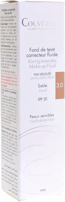 AvA ne Couverance Fond de Teint Correcteur Fluide SPF20 3 0 Sand Deze foundation is speciaal ontwikkeld voor de gevoelige huid met licht tot matige oneffenheden De fluide heeft een aangename textuur met een goede afwerking voor alle huidtypen De huid wordt met een SPF 20 beschermt tegen de zon Kleur DorA c Gebruik Breng de foundation aan na het aanbrengen van een hydraterende crA me Strijk de foundation egaal uit over de huid van binnen naar buiten Dit kan met een kwast beautyblender of de handen Vergeet de hals niet