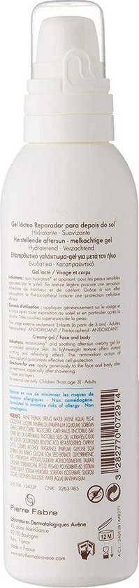 Avene Solaires RA c parateur AprA s Soleil Gel LactA c Herstellende Aftersun Melkachtige Gel Herstellende Aftersun Melkachtige Gel Herstellende aftersunmelk gel voor het gezicht en lichaam dat direct hydrateert en verzacht Laat de huid ademen en verfrist direct door de lichte textuur Gebruik royaal aanbrengen op de gevoelige verbrande huid bij voorkeur na het douchen