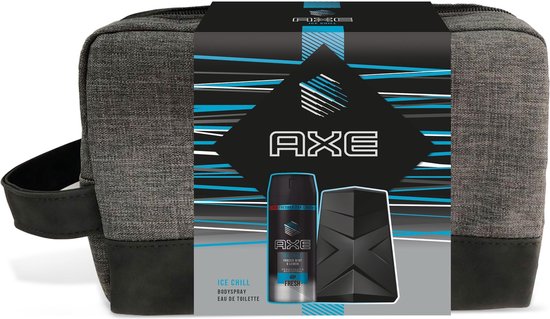 De Ice Chill geschenkset bevat een 100 ml Ice Chill eau de toilette en een 150 ml Deodorant Bodyspray, verpakt in een toilettas van AXE.