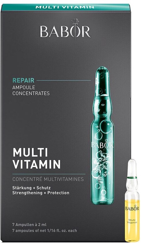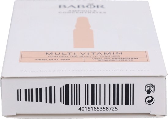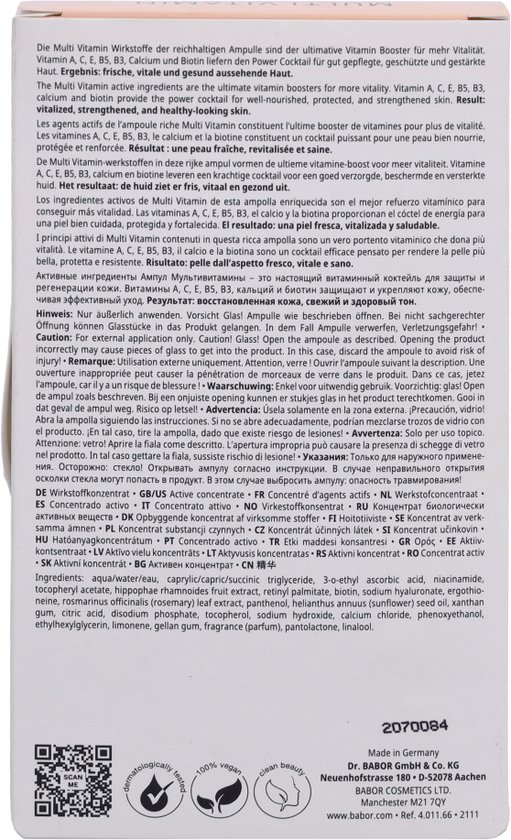BABOR Multi Vitamin Ampoule Concentrates vormen en vitamine boost voor meer vitaliteit en een sterkere huid De werkstoffen versterken de huidbarriere en geven vermoeide huid meer vitaliteit uitstraling en frisheid Verrijkt met Hyaluronzuur dat een vochtbindende en hydraterende werking heeft De oliepareltextuur zorgt voor een zachte huid die er fris vitaal en gezond uitziet
