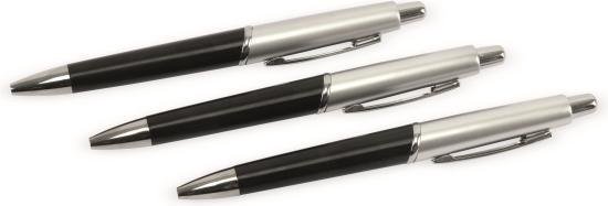 Set bestaat uit 3 moderne balpen met clip voor bevestiging aan schrijfmateriaal en printkopbediening. Kleur: zilver. Lengte: 138 mm.