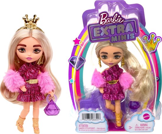 - Barbie Extra Mini’s zijn poppen van 14 cm met een betoverend uiterlijk, coole outfits en accessoires, en een Barbie Extra Mini’s poppenstandaard.