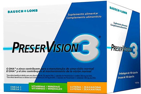 PreserVision 3 is een voedingssupplement voor het behoud van een goede oogfunctie dat de drie belangrijkste soorten bestanddelen samenbrengt: antioxidanten (vitamines C en E, zink), omega 3 en carotenoïden (luteïne et zeaxanthine).