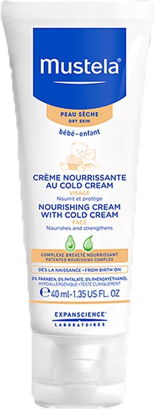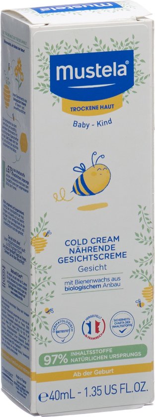 Mustela BA c bA c CrA me Nourrissante Visage au Cold Cream Voedende GezichtscrA me met Cold Cream Met deze crA me wordt de huid onmiddelijk langdurig gekalmeerd door het voedende en beschermende Cold Cream Ceramiden en shea boter De huid wordt versterkt en beschermt tegen invloeden van buitenaf Deze crA me voedt de huid op een dieper niveau waardoor het natuurlijke afweermechanisme wordt behouden