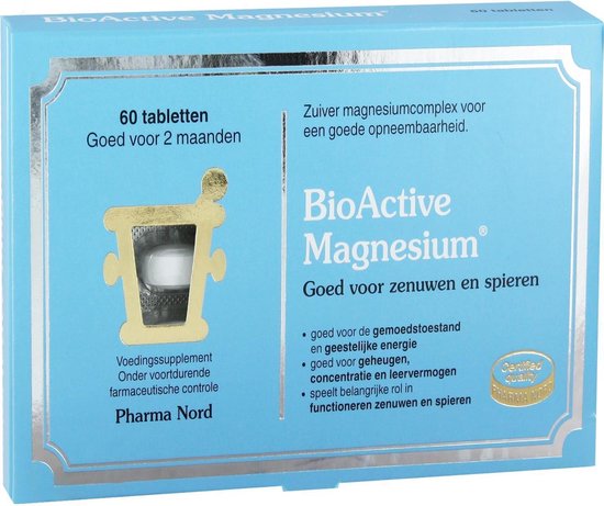 BioActive Magnesium voor zenuwen en spieren. Magnesium is betrokken bij meer dan 300 verschillende enzymatische processen in het lichaam, waarvan er veel een natuurlijke rol spelen voor een normaal functioneren van de spieren, de zenuwen en het psychisch functioneren. Bovendien draagt magnesium bij aan de vermindering van vermoeidheid. Het zuivere magnesiumcomplex BioActive Magnesium bevat drie verschillende soorten magnesium voor een prima opneembaarheid. Elke goed oplosbare tablet bevat 200 mg magnesium.
