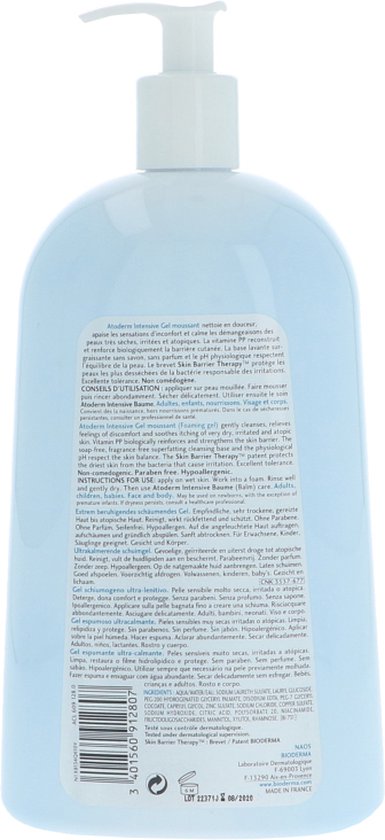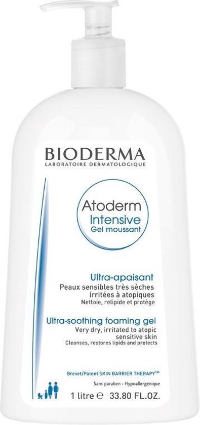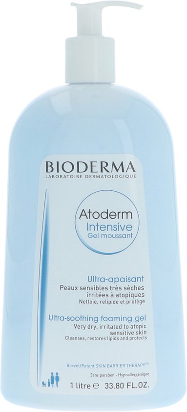 Bioderma Atoderm Intensive Gel Moussant Overvette schuimende reinigingsgel voor de gevoelige en uiterst droge tot atopische huid Reinigt en kalmeert en is parabeenvrij zonder parfum en zonder zeep Hypoallergeen Gebruik Op nat gemaakte huid aanbrengen laten schuimen en goed afspoelen Voorzichtig afdrogen Geschikt voor gezicht en lichaam van volwassen kinderen en baby s