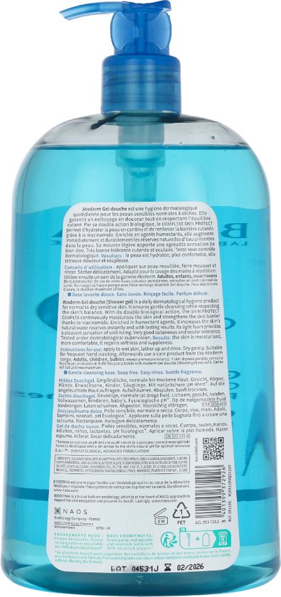 Bioderma Atoderm Gel Douche Nettoyant Douceur Zachte douchegel voor de droge gevoelige huid Reinigt en verzacht Zonder zeep hypoallergeen en parabenenvrij Gebruik Op de natgemaakte huid aanbrengen laten schuimen goed afspoelen en voorzichtig afdrogen Voor gezicht en lichaam