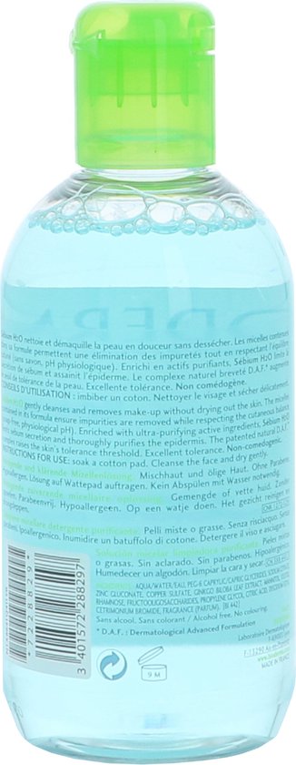 Bioderma SA c bium H2O Solution Micellaire Reinigende zuiverende micellaire oplossing voor de gemengde of vette huid Talgregulerende werking Parabenenvrij en hypoallergeen Gebruik Aanbrengen op een wattenschijfje gezicht en ogen reinigen