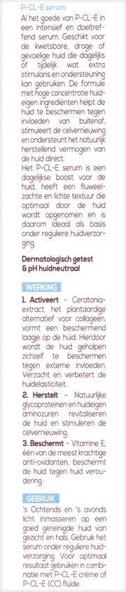 P-CL-E serum is een dagelijkse boost voor de huid. Het serum heeft een lichte en fluweelzachte textuur die optimaal door de huid wordt opgenomen. P-CL-E serum is daarom ideaal als basis voor dagelijkse huidverzorging. Deze multifunctionele crème is geschikt voor alle huidtypen en is speciaal ontwikkeld voor de: