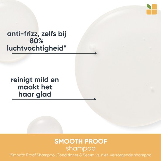 Matrix Biolage Smoothproof Shampoo Net als de waterafstotende cameliaplant zorgt Smoothproof voor maximale controle van het vochtgehalte en houdt het frizz tegen De shampoo reinigt het haar en omhult het haar met een dunne beschermlaag om beschadiging te voorkomen Maakt het haar zacht en verzorgd Gebruiksaanwijzing Aanbrengen op nat haar laten schuimen en uitspoelen