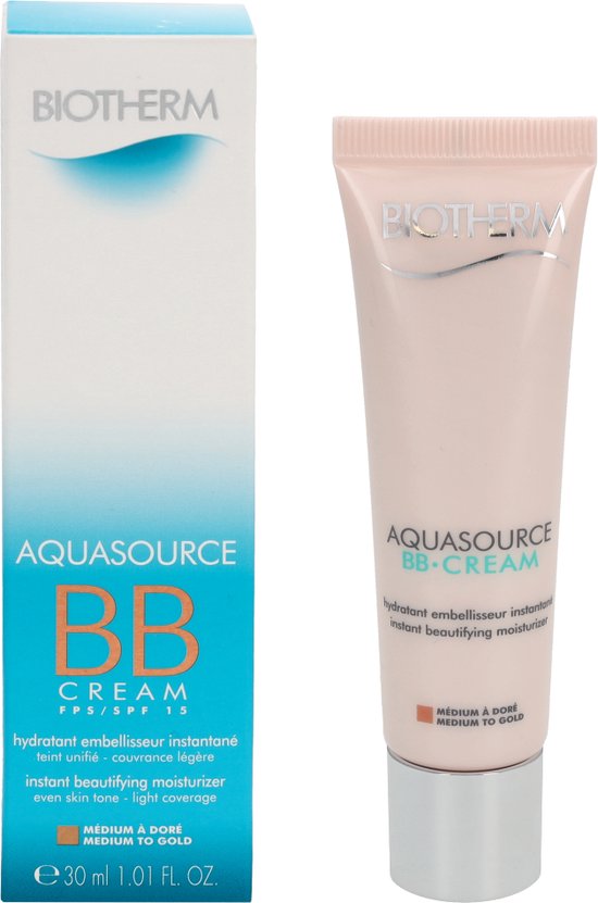 Biotherm Aquasource BB Cream Instant Beautifying Moisturizer Deze BB cream is een licht getinte crA me die een egale teint aan de huid geeft De crA me is uniek door de combinatie van een krachtige hydratatie en een BB effect Daarnaast is de crA me ook voorzien van een SPF 15 De 100 minerale pigmenten zorgen voor een natuurlijke egale teint Kleur Licht tot medium Gebruik Breng de BB cream na de reiniging aan op het gezicht Als je meer dekking wilt breng nog een laagje aan