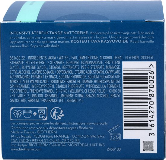 Biotherm Aquasource Night Spa Triple Spa Effect Night Balm Deze nachtcrA me is een samenstelling van een balsem en een gel De crA me herstelt de hele nacht lang het vochtgehalte in de huid bij het wakker worden voelt de huid zacht en veerkrachtig aan Nacht na nacht wordt de huid getransformeerd droogterimpeltjes verminderen de teint straalt meer en de huid voelt steviger aan Gebruik Breng de nachtcrA me aan op de gereinigde huid laat deze 5 minuten inwerken neem af met een vochtig watje en laat de rest drogen