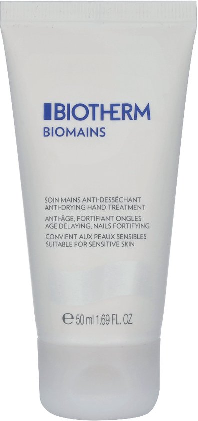 Biomains van Biotherm is een verzorgende en hydraterende crème voor de handen en nagels. Geformuleerd met Life Plankton™ hersteld, kalmeert en voedt de crème de droge huid en herstelt deze de beschermende barrière van de huid. Rijk aan D. Panthenol dat de nagels versterkt. Vermindert tekenen van huidveroudering dankzij het UV filter (BF 4).De crème wordt snel geabsorbeerd en is waterbestendig. Voor soepele, zachte handen en sterke nagels.