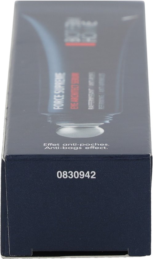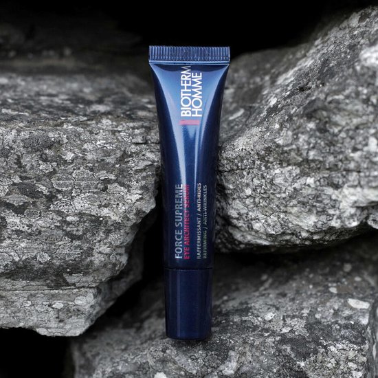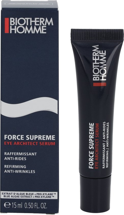 Biotherm Homme Force Supreme Eye Architect Serum Dit serum is voorzien van 3 actieve ingredienten Blauwe algenextract Pro Xylane en Life Plankton Deze ingredienten bevatten herstellende eigenschappen Het resultaat is vermindering van rimpels en donkere kringen een meer uitgeruste uitstraling en een zachtere huid Gebruik Breng het serum s ochtends en s avonds aan op de huid rond de ogen Laat het product inwerken en stimuleer de bloedsomloop van de huid door licht te masseren