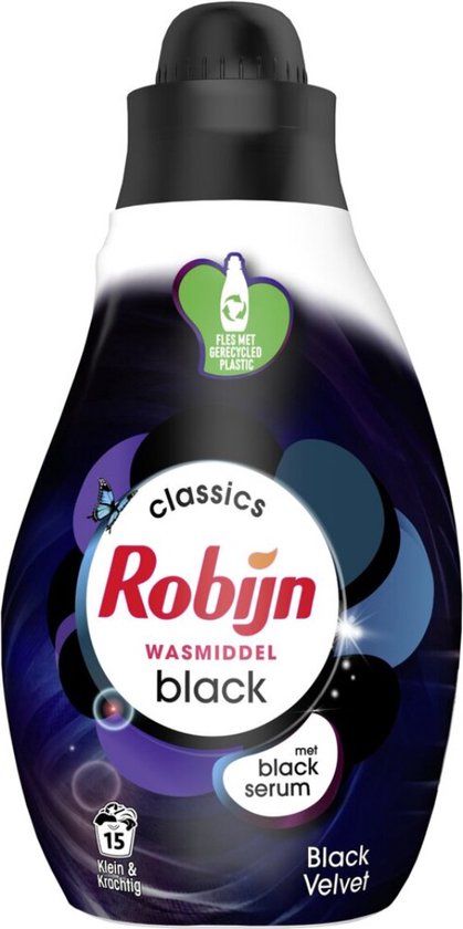 Robijn Klein & Krachtig Classics Black Velvet Vloeibaar Wasmiddel helpt je donkere en zwarte kleding langer als nieuw te houden. De unieke formule is speciaal ontwikkeld voor de donkere en zwarte was.