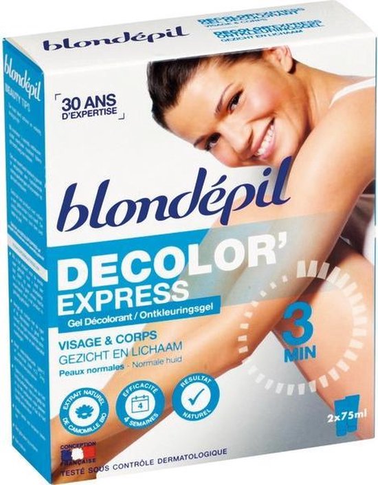 Blondépil Decolor express ontkleuringsgel – voor gezicht en lichaam Productbeschrijving: Blondépil Decolor express ontkleuringsgel – voor gezicht en lichaam Blondépil Decolor express ontkleuringsgel maakt ongewenste haartjes minder zichtbaar en houdt je huid zijdezacht. De ontkleuringsgel is geschikt voor de normale huid en het blonde resultaat blijft tot vier weken zichtbaar. De gel mix je van te voren uit de twee meegeleverde tubes. Als de gel voorbereid is, smeer je het op je gezichtshuid of op het lichaamsdeel dat je behandelen wil. Drie minuten laten inwerken op het gebied dat je wil ontkleuren, daarna afspoelen met ruim water. Gebruik je de Blondépil ontkleuringsgel af en toe, lees dan altijd de bijsluiter. Kenmerken: Dermatologisch getest Natuurlijk blond resultaat Met kamille extract Resultaat in 3 minuten Bijsluiter in het Frans en Nederlands