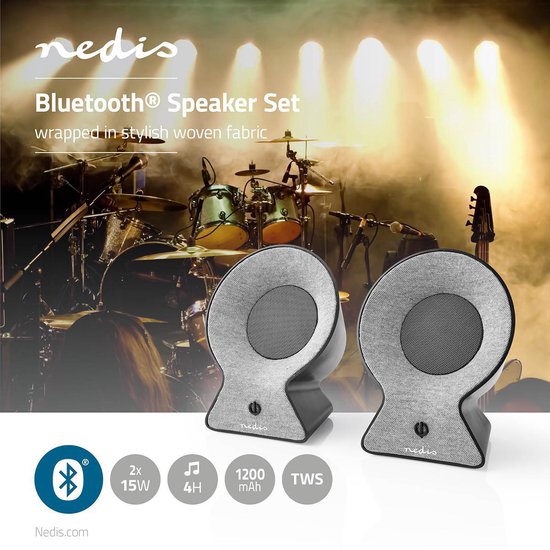 Neem je muziek met je mee – waar je ook naartoe gaat – met dit paar chique Nedis® Bluetooth® v5.0-speakers. De ingebouwde 1200 mAh-accu garandeert dat de muziek maar liefst vier uur op een enkele lading blijft spelen