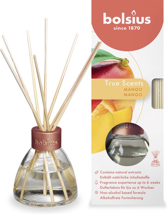 Verspreid een tropisch feest door de kamer met deze geurverspreider van Bolsius. Gemaakt met natuurlijke extracten en zonder palmolie. Ervaar de pure geurbeleving van fruitige mango bij jou thuis. Geniet van de tropische geur van mango, alsof je op een exotisch eiland bent. Gebruik deze geurstokjes bijvoorbeeld om het gevoel van de zomer weer in jouw huis te krijgen. Een echte aanrader!