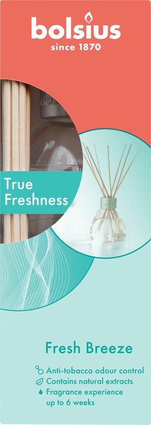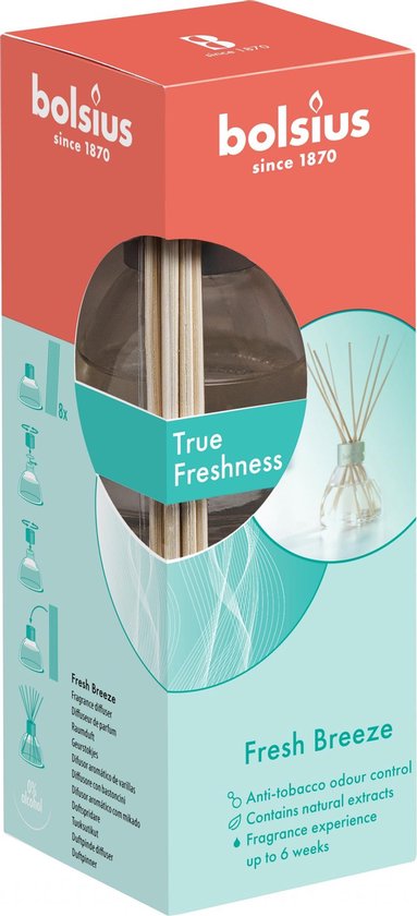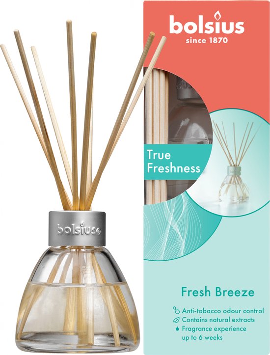 Zorg voor een frisse geur in huis met deze geurverspreider uit de collectie True Freshness van Bolsius. De stokjes zuigen de vloeistof uit het potje en verspreiden de geur in je huis. De geurverspreider is gemaakt van natuurlijke extracten, zodat jij zo lang mogelijk kunt genieten van deze heerlijke geur.