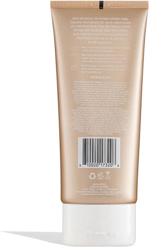Bondi Sands Gradual Tanning Lotion Tinted Skin Perfector is een voedende, vochtinbrengende lotion voor het lichaam en geschikt voor alle huidtinten. Deze geleidlijk zelfbruinende lotion bevat bruiningspigmenten die onmiddellijk zorgen voor een egale huid en kan dagelijks worden gebruikt om een natuurlijke bruine teint op te bouwen.