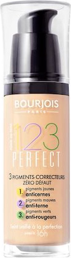 Play with colour correction to achieve the perfect complexion nStart your day with Bourjois 123 Perfect Foundation for a flawless complexion even to perfection that lasts up to 16 hours Its innovative formula combines 3 correcting pigments for flawless skin with zero imperfections 1 Yellow pigments to conceal dark circles and give that rested look 2 Mauve pigments to correct dullness and boost radiance 3 Green pigments to neutralise redness for an even complexion nSo what are you waiting for When you need to look stunning all day long 123 Perfect Foundation is the effortless way to even out your skin tone nHand blend for a streak free finish or use a blending tool for that glamorous airbrushed look One coat delivers medium coverage but it can be built up without getting cakey nFor a flawless semi matte finish that brightens up even the dullest complexion and lasts and lasts and lasts Bourjois 123 Perfect Foundation deserves a spot on your top ten list of beauty secrets nn Pump dispensern For a radiant flawless complexionn Conceals all imperfections thanks to 3 colour correcting pigments green that neutralises redness yellow that conceals dark circles and mauve that corrects dullnessn Contains cotton flower extract that has hydrating and anti shine propertiesn SPF 10 UV screen that protects skin from UVA and UVB raysn Suitable for all skin types even combination skin