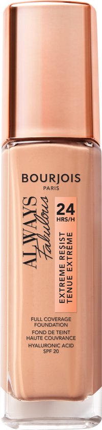 Ontdek de Bourjois Always Fabulous Foundation. Deze hoogwaardige olie-vrije foundation dekt perfect, maar voelt altijd licht en comfortabel aan. De 24HR formule bevat een speciale Stay-In-Place-technologie, waardoor de foundation dag en nacht op zijn plek blijft zitten. De huid wordt continu gehydrateerd en beschermt dankzij de verzorgende ingrediënten als vitamine E, hyaluronzuur en SPF 20. De fluweelzachte foundation biedt een opbouwbare dekking. Zo hoef je nooit meer te kiezen tussen een hoge dekking of een gehydrateerde huid!