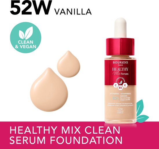 Bourjois Healthy Mix – 52 – Vanilla, Serum Foundation, laat de huid onmiddellijk stralen, hydrateert tot 24 uur lang, vegan formule, dauwachtige finish, houdt de hele dag lang, 30 ml