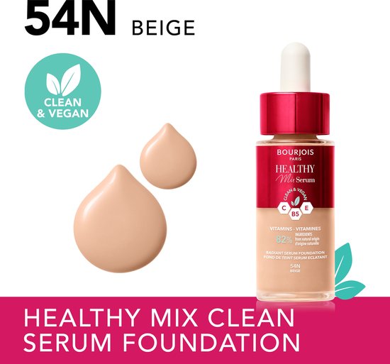 Bourjois Healthy Mix – 54N – Beige, Serum Foundation, laat de huid onmiddellijk stralen, hydrateert tot 24 uur lang, vegan formule, dauwachtige finish, houdt de hele dag lang, 30 ml