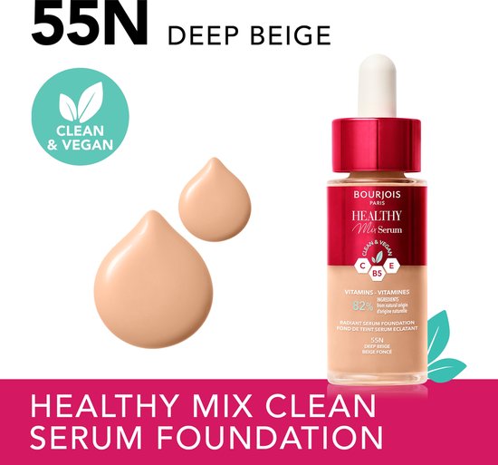Bourjois Healthy Mix – 55N – Deep Beige, Serum Foundation, laat de huid onmiddellijk stralen, hydrateert tot 24 uur lang, vegan formule, dauwachtige finish, houdt de hele dag lang, 30 ml