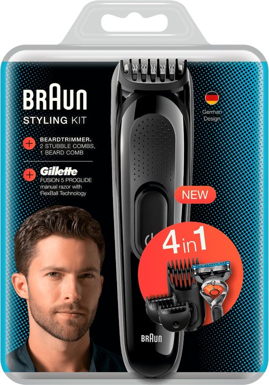 De Braun SK3000 Styling Kit is een 4-in-1 baard- en haartrimmer. Met zijn opzetstukken doe je nauwkeurig deze vijf stylingjobs: stoppels, kort, middellange en lange baarden, trimmen en scheren.