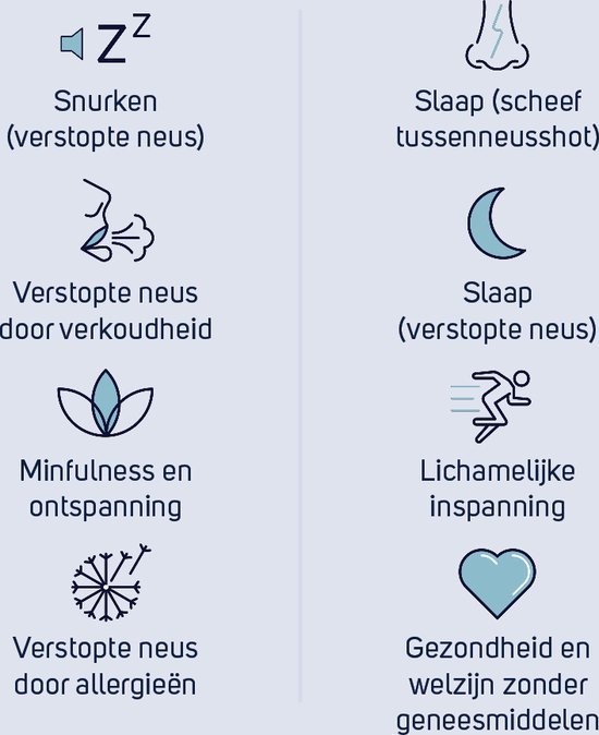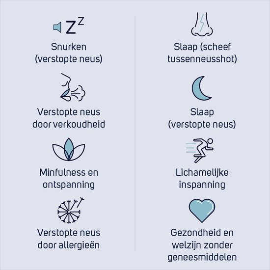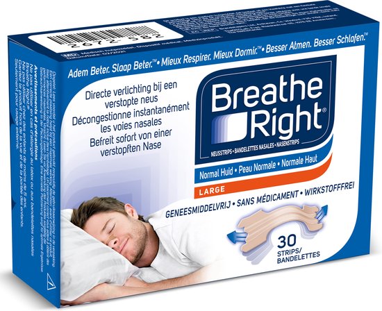 Medisch hulpmiddel Breathe Right is een transparante, wereldwijd gepatenteerde neusstrip die helpt om tijdens de slaap vrijer door de neus te ademen. Ideaal als je neus verstopt zit of als je snurkt. De neusstrips zijn gemaakt van flexibele, veerachtige banden die precies boven de neusgaten passen. Doordat de twee vleugels proberen terug te keren naar hun oorspronkelijke vorm, heffen ze de zijkanten van de neus op en openen ze de neusholtes waardoor je meer lucht door de neus binnenkrijgt.