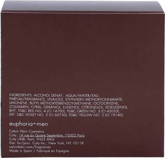 Euphoria Men bevat topnoten van gember en peper. Middennoten zijn zwarte basilicum en ceder. Basisnoten zijn amber, patchoeli, Braziliaans roodhout en suede. Calvin Klein is van oorsprong een kledingmerk en verkoopt naast kleding onder andere ook horloges, sieraden, tassen en make-up. Echter staat Calvin Klein vandaag de dag ook zeker bekend om haar vele parfums. Kernwoorden voor de parfums van het merk Calvin Klein zijn modern, sophisticated, tijdloos en energiek. De architectonische schoonheid trekt zowel mannen als vrouwen aan. Met een parfum van Calvin Klein zit je altijd goed.