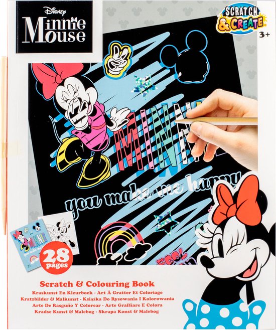 Kleurboek van Minnie Mouse met 28 pagina’s aan kleurplaten en kraskunst-tekeningen. Inclusief houten kraspen en 14 pastelkleurge kraskunstplaten. Geschikt voor kinderen van 3 jaar en ouder.