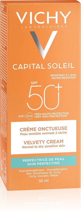 Vichy IdA c al Soleil Skin Perfecting Velvety Cream SPF50 De droge en gevoelige huid moet beschermt worden tegen UV straling Dat kan met deze romige crA me Bevat Mexoryl SX XL die een uitzonderlijke werking hebben op lange afstand UVA straling Hyaluronzuur en lichte siliconen hydrateren de huid direct Maakt de huid gladder geeft een mooie gloed in de zon en beschermt de huid tegen pigmentvlekken en lijntjes en rimpels