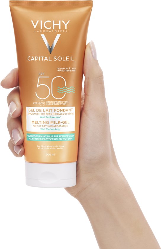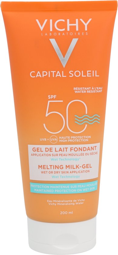 Vichy Capital Soleil Ultra Melting Milk Gel SPF50 Ultrasmeltende melkgel voor gebruik op vochtige of droge huid SPF50 UV bescherming met Mexoryl XL voor brede bescherming tot en met lang UVA De hypoallergene formule ZONDER PARABENEN werd onder dermatologisch toezicht getest op gevoelige huid Verrijkt met kalmerend versterkend en regenererend gemineraliseerd water van Vichy Onzichtbare finish Blijft ook na het zwemmen of sporten beschermen Hoge bescherming Voor mannen en vrouwen Gebruik Breng het product vlak voor de blootstelling aan Regelmatig en royaal opnieuw aanbrengen zeker na het zwemmen transpireren en afdrogen De oogcontour vermijden