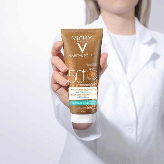 Hoge zonbescherming Geen witte waas Eco bewuste verpakkingDe Vichy Capital Soleil Solar Eco Melk SPF50 biedt een hoge bescherming tegen schadelijke UV straling van de zon UV straling zorgt voor 80 voor de zichtbare tekenen van huidveroudering in het gezicht blijkt uit onderzoek van Vichy UV straling valt onder het zogenoemde exposoom invloeden van buitenaf die effect hebben op de huid Deze hydraterende zonnemelk voor het hele gezin trekt snel in de huid is lichtgewicht en plakt niet Daarnaast laat de zonnemelk geen witte waas achter op de huid De ecologische verpakking bevat zo min mogelijk plastic en is ontworpen met biologisch afbreekbare ingrediA