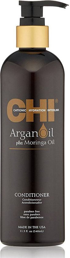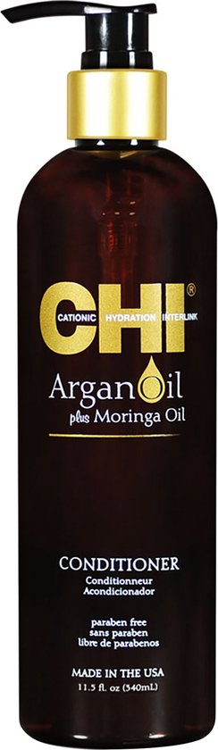 CHI Argan Oil Conditioner is een conditioner verrijkt met argan olie, moringa olie en vitaminen die het haar optimaal voeden en hydrateren. De conditioner is geschikt voor kroezend, beschadigd en futloos haar. De CHI Argan Oil Conditioner bevat een systeem met vier delen die bestaan uit Vitamine E, omega vetzuren, essentiële oliën en vocht om het haar direct en intens te voeden. Het haar zal glad en pluisvrij zijn, en een ongelooflijke glans hebben. De conditioner herstelt de gehele conditie van het haar en zorgt ervoor dat het haar gemakkelijker te stylen is. Deze conditioner is vrij van parabenen.