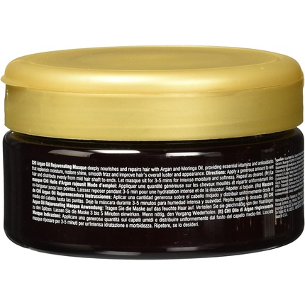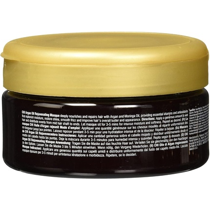CHI Argan Oil Rejuvenating Masque Intense verzorging en herstel voor het haar Bevat Argan en Moringa olie die op hun beurt de nodige vitaminen en anti oxidanten afgeven aan het haar Dit zorgt voor herstel van het vochtgehalte extra glans en anti frizz Uw haar zal er over het algemeen gezonder uit zien en ook zo aanvoelen Gebruiksaanwijzing Gelijkmatig op nat haar vanaf het midden tot te punten aanbrengen Vervolgens ca 3 tot 5 minuten laten inwerken