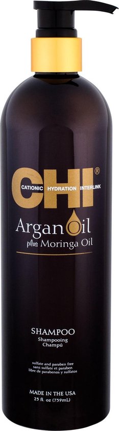 CHI Argan Oil Shampoo combineert een unieke mix van Argan en Moringa olie om het haar op een milde wijze te reiningen en het beschadigde of doffe haar te herstellen en verzorgen De shampoo zorgt tevens voor een herstel van het vochtgehalte en het versterken van het haar Het resultaat Een gezond en glanzend kapsel Gebruiksaanwijzing Aanbrengen op nat haar inmasseren en verspreiden tot in de punten Vervolgens uitspoelen Voor het beste resultaat gebruikt u vervolgens de CHI Argan Oil Conditioner