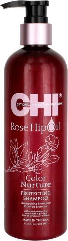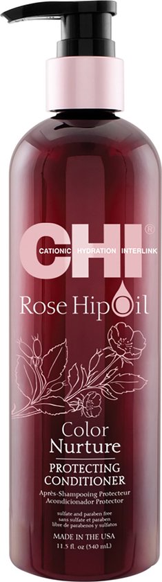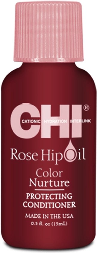 CHI Rose Hip Oil Color Nurture Protecting Conditioner Herstelt vocht in gekleurd haar en gaat dof en droog haar tegen De pH waarde zorgt voor een gesloten schubbenlaag waardoor de kleur langer behouden blijft Vitamine C revitaliseert en zrogt voor extra uitstraling en glans Gebruik Aanbrengen in de lengtes en punten Uit spoelen met koud water